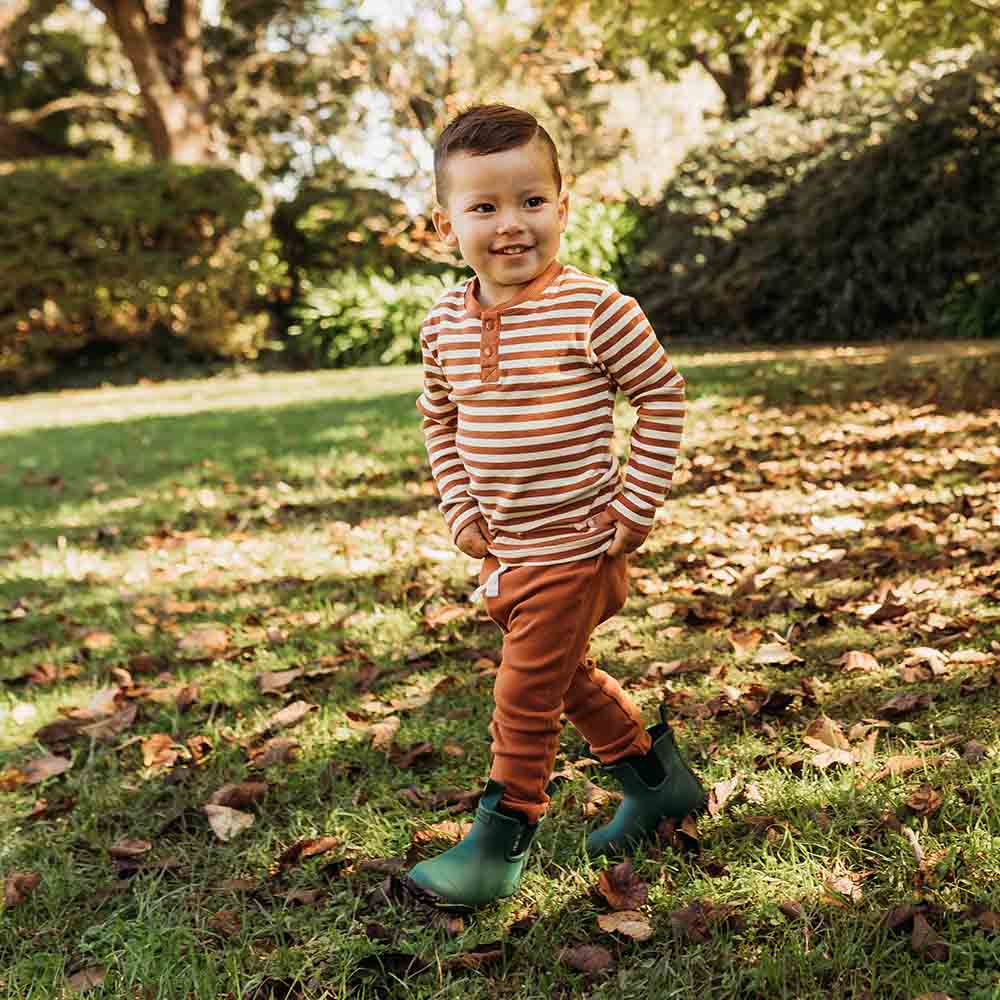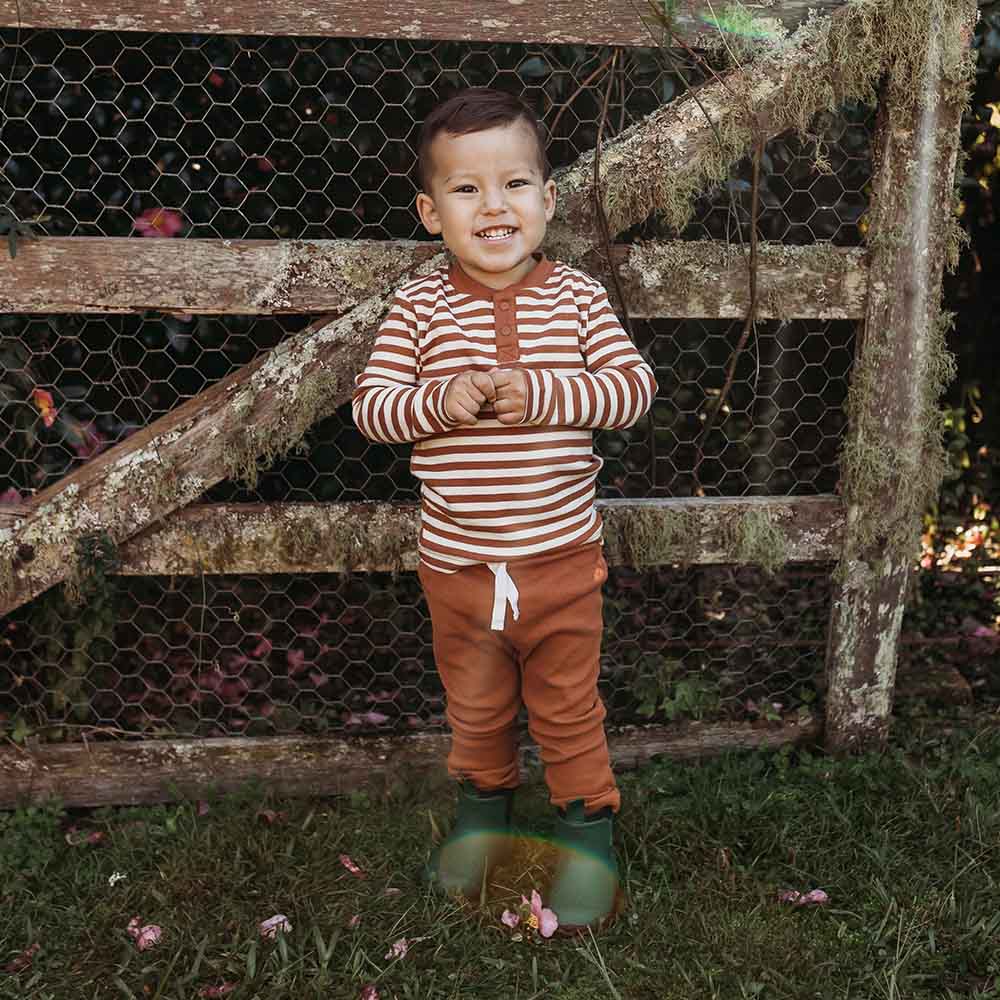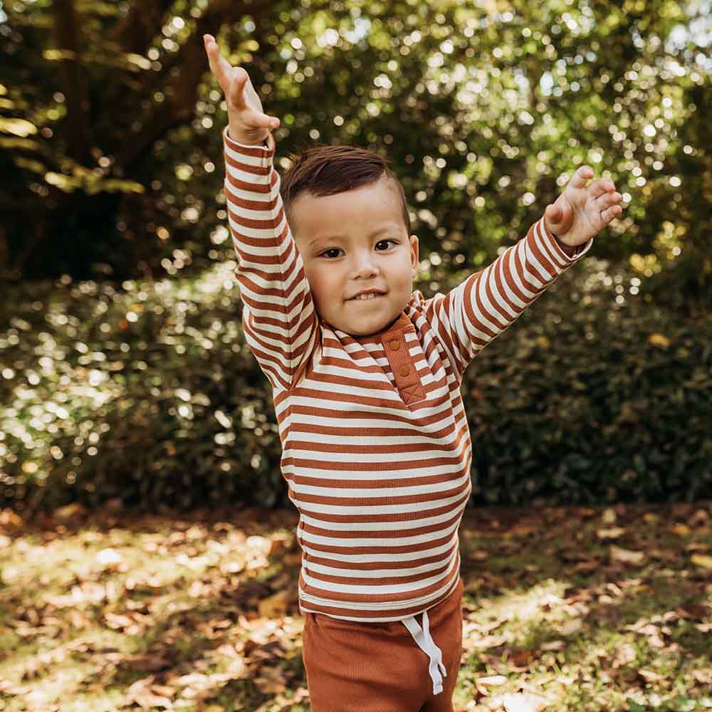 Our long sleeve Hunny Henleys are practical whilst being very stylish and coordinate perfectly with our pants and shorts - mix and match is the aim of the day here! Our Biscuit Stripe Henley looks beautiful with our Biscuit pants, Pebble pants, Olive pants, the list goes on. Made with organic cotton rib they are easy to wear and comfy for bub. They have two snap buttons making it easy to get on and off bub. All Snuggle Hunny clothing is made with GOTS Certified Organic Cotton CU 1182228.
