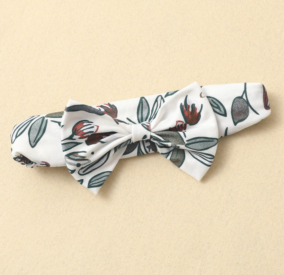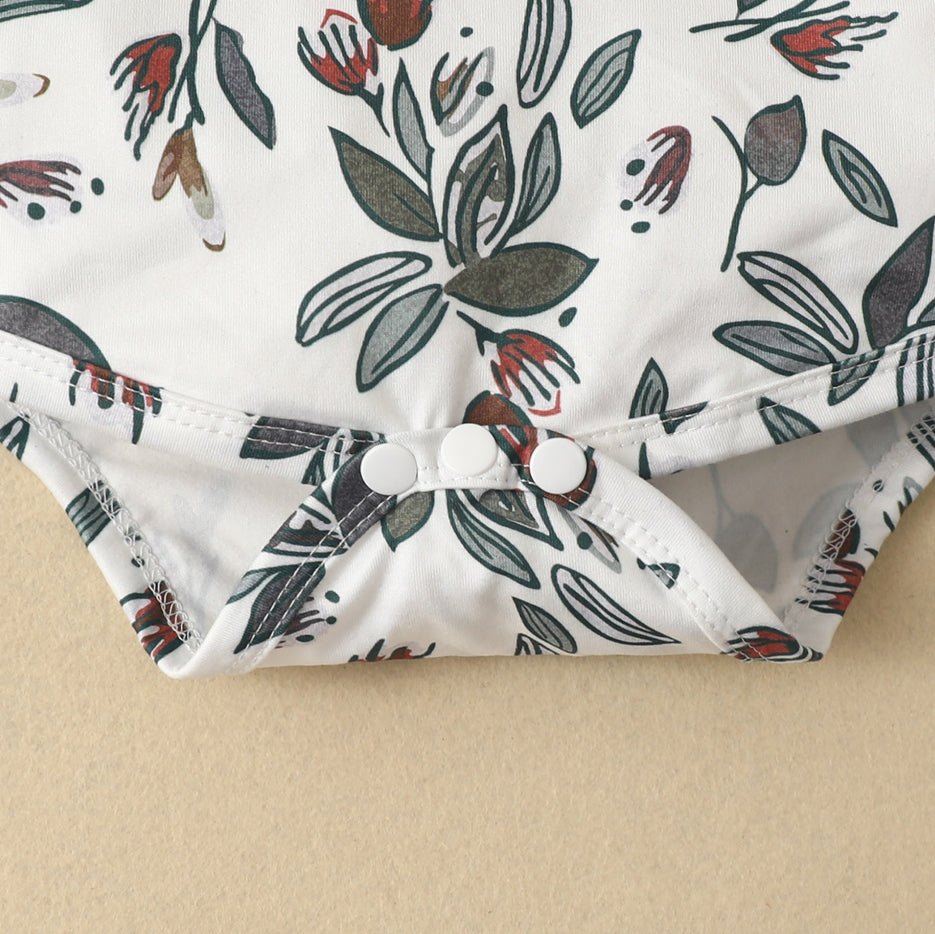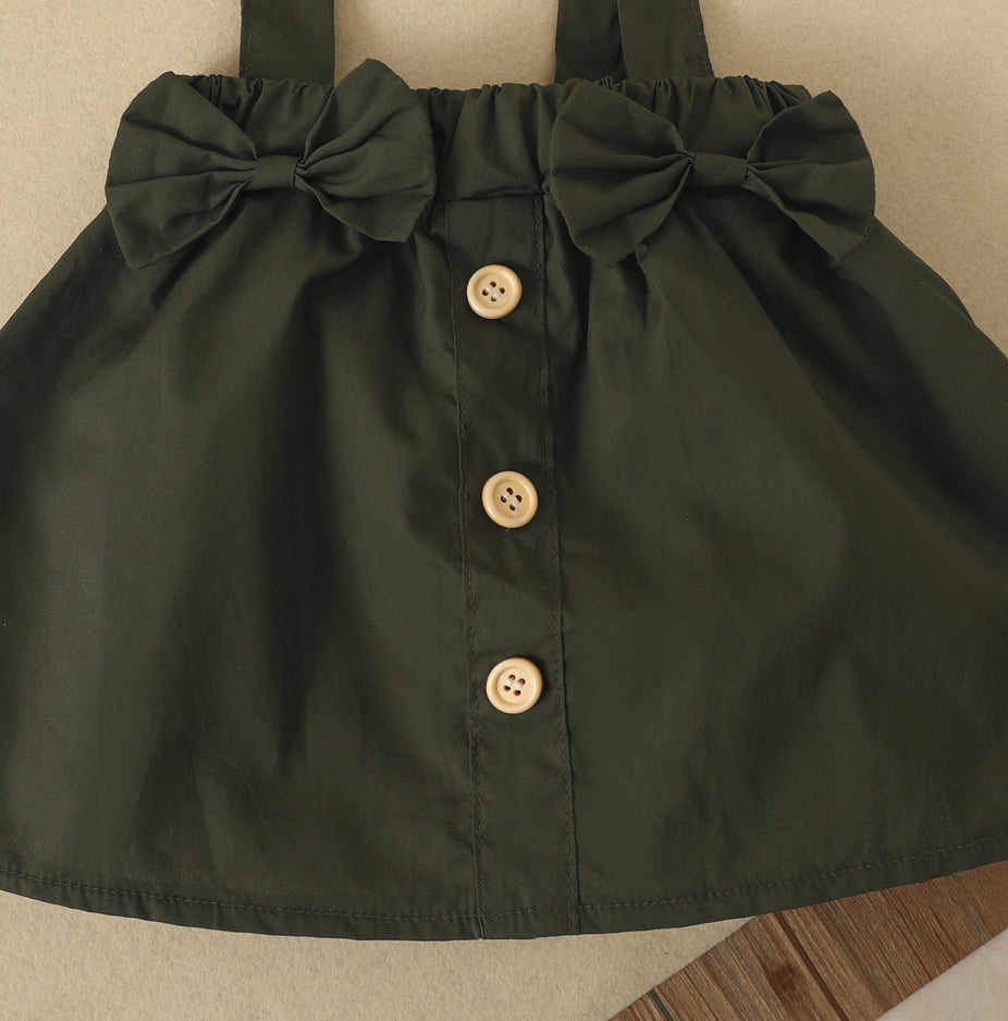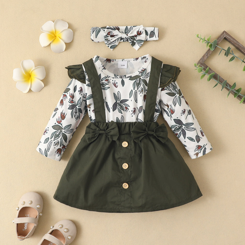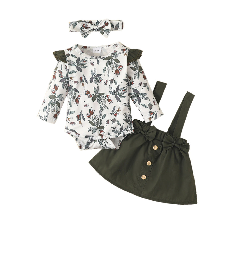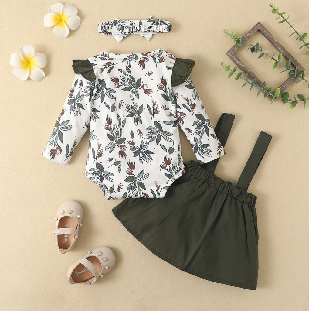 Girls long sleeve olive leaf three piece romper and overall skirt set with matching headwrap.