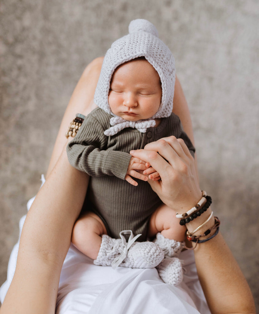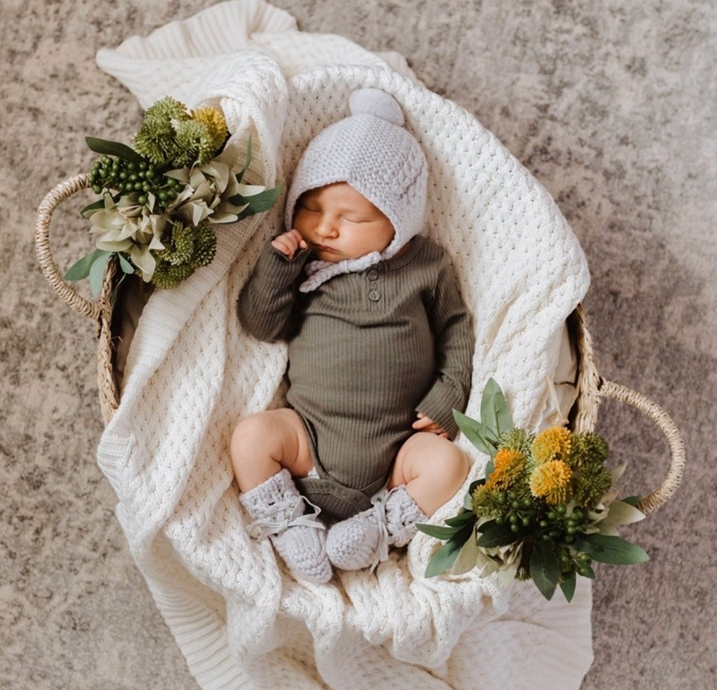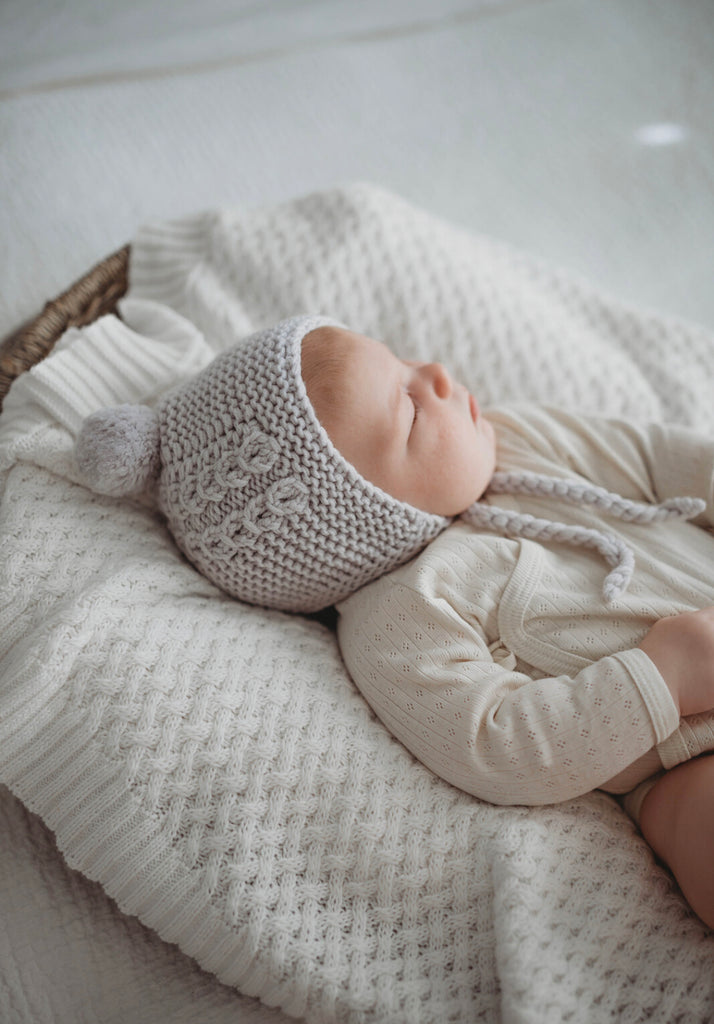 Fall in love with our handknit soft and snuggly Grey Merino Wool Bonnet & Bootie Set. Handknit heirloom quality made from 100% Merino Wool.