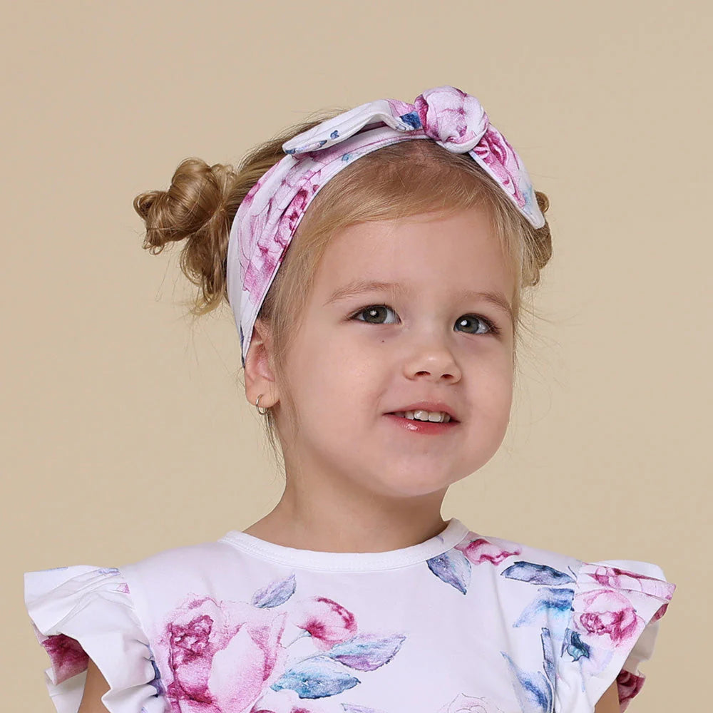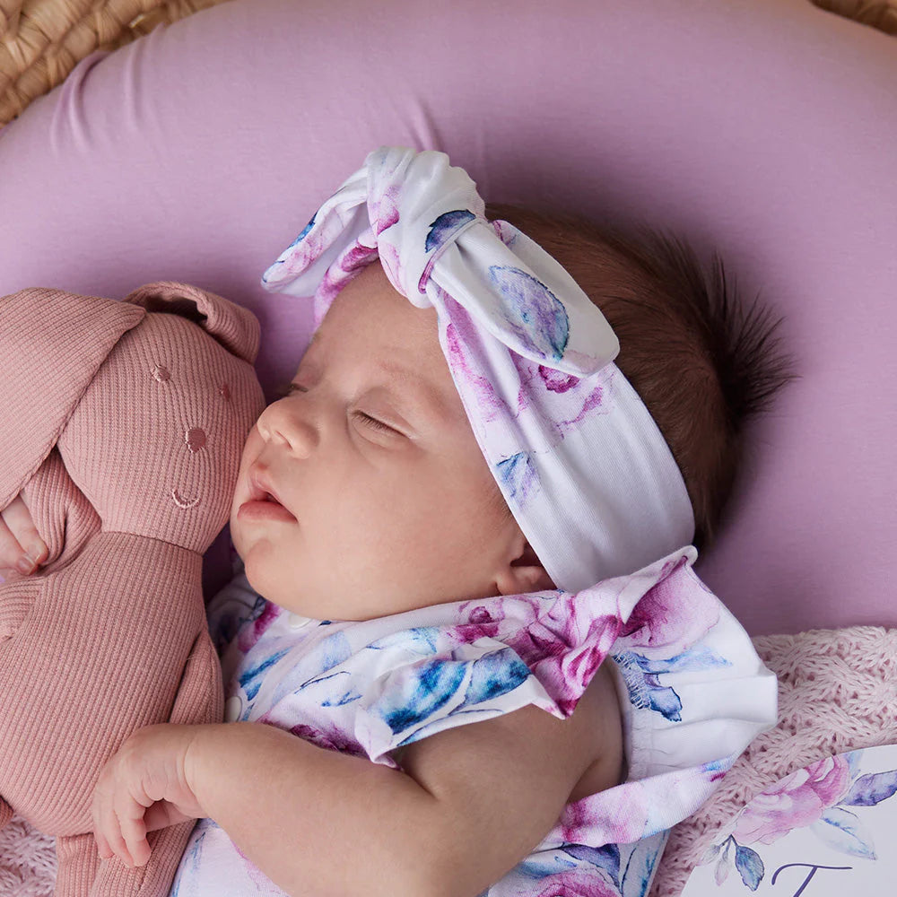 Our organic cotton Lilac Skies topknot matches beautifully with our wraps, dresses, growsuits and bodysuits. Made with GOTS Certified Organic Cotton CU 1182228.