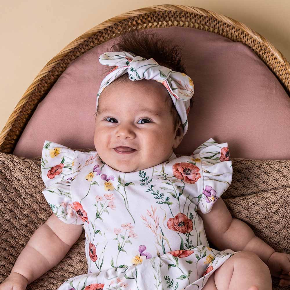 Our organic cotton Meadow topknot matches beautifully with our Meadow Range including wraps, dresses, growsuits and bodysuits. Made with GOTS Certified Organic Cotton CU 1182228.