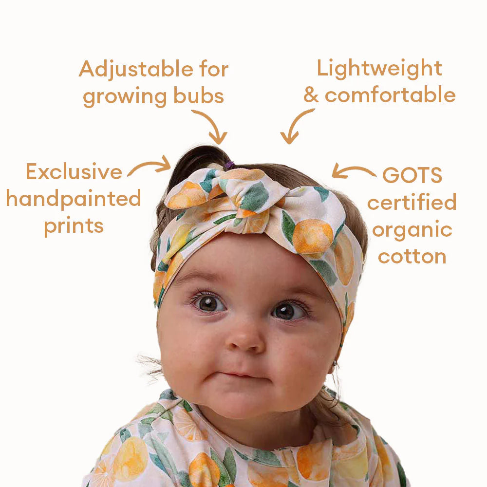 Our organic cotton Sunny Citrus topknot is made with GOTS Certified Organic Cotton CU 1182228.
