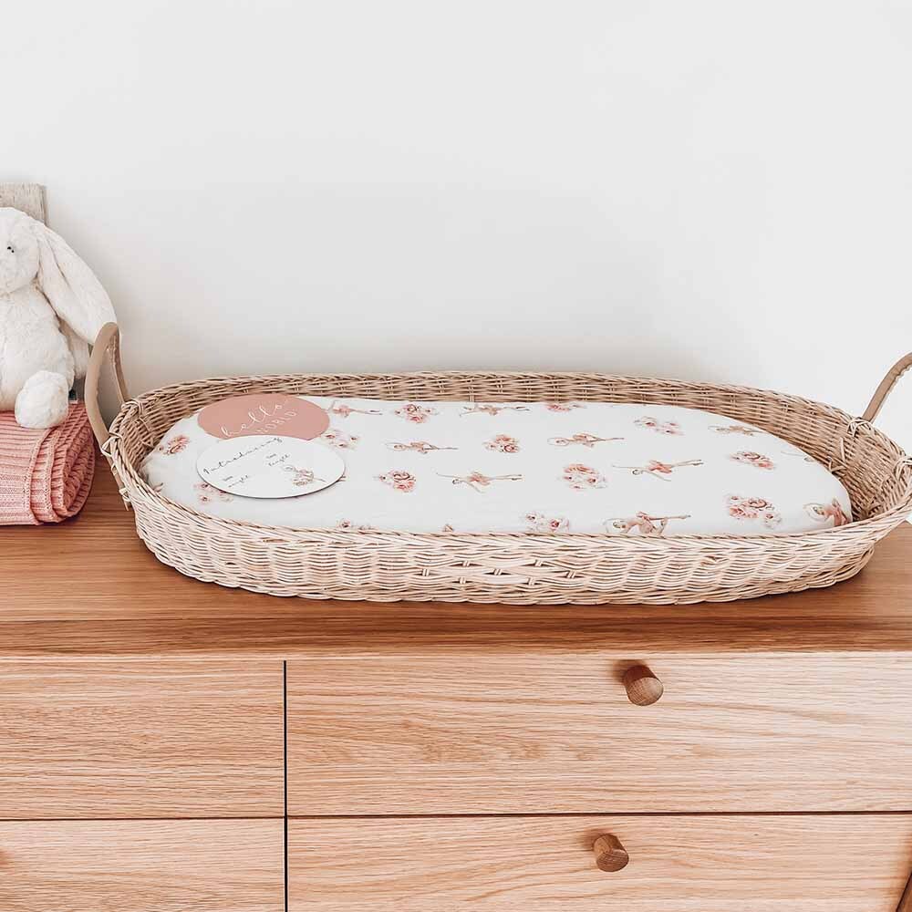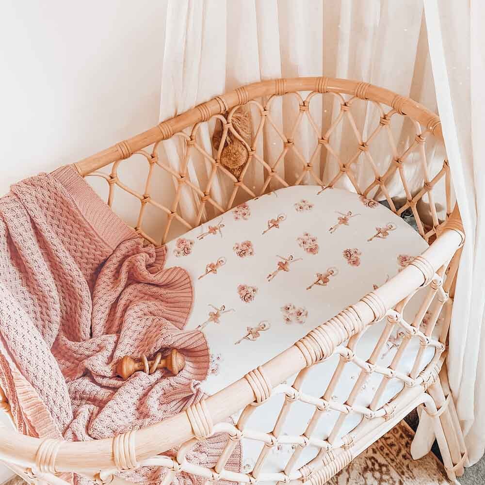 Snuggle Hunny Ballerina Fitted Bassinet Sheet doubles as a Change Pad Cover and is made from snuggly soft stretch cotton jersey. It features our exclusive Snuggle Hunny Ballerina print and comes in a matching drawstring bag.