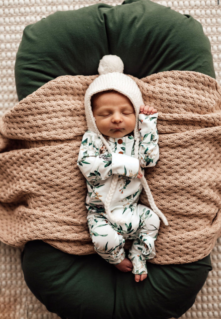 Also Pictured: Ivory merrino Bonnet, cream and hazelnut diamond knit blankets, olive bassinet sheet