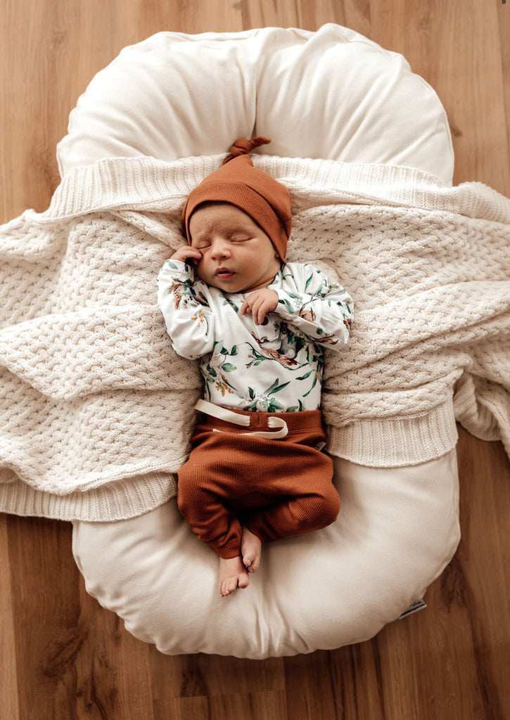 Also Pictured Biscuit Knotted Beanie, Eucalypt Beanie, Biscuit Pants, Cream diamond knit blanket.