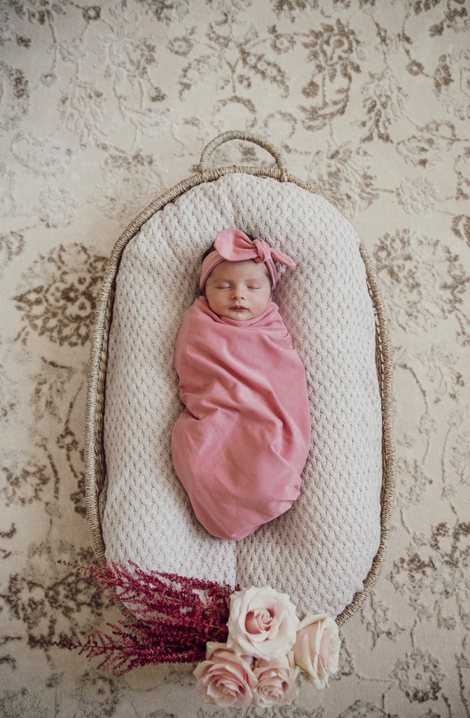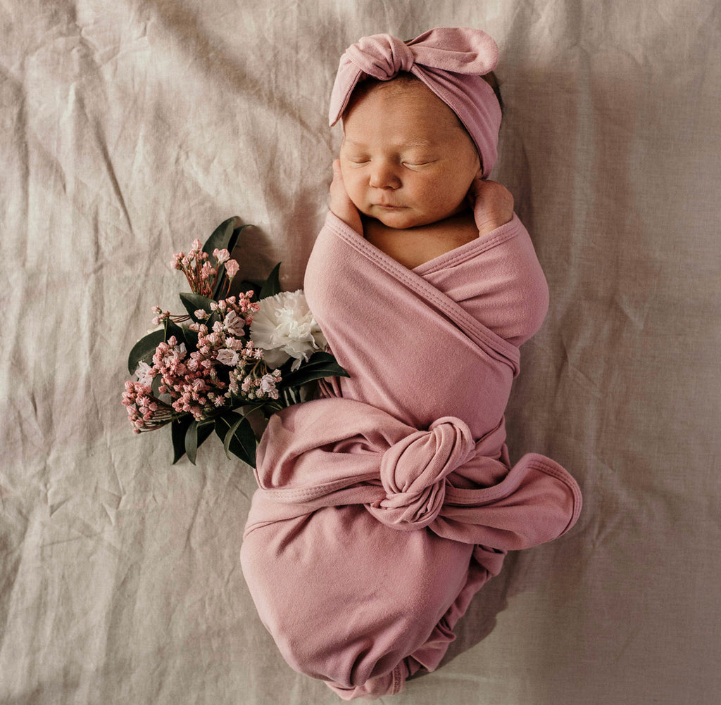 Our Cotton Jersey Wrap is soft and stretchy, it moves and stretches with baby. This wrap comes with a matching topknot.