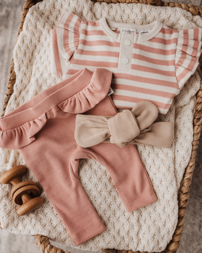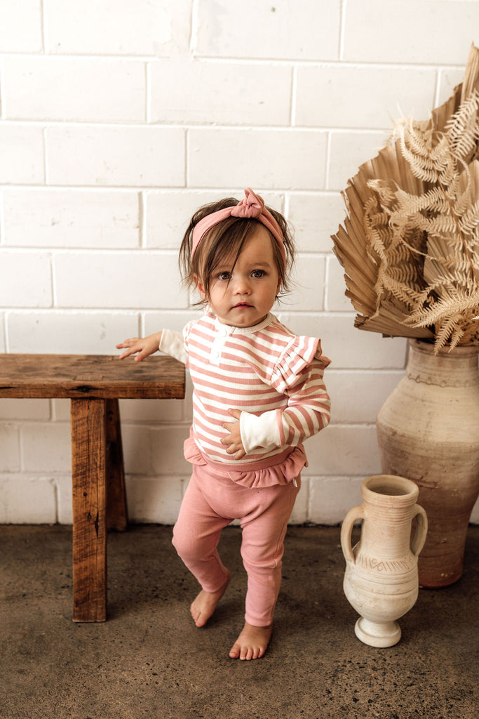 Designed for newborns and little adventurers, our Organic Long Sleeve Bodysuits are functional and beautiful. Soft and stretchy, they are an easy-care, fuss-free option that is easy to wear thanks to their modern, fitted style. Wear them on their own for a relaxed outfit or coordinate with our organic pants for a complete look. Our organic pants in Rose Stripe have a sweet peplum frill to match the sleeves on this style.