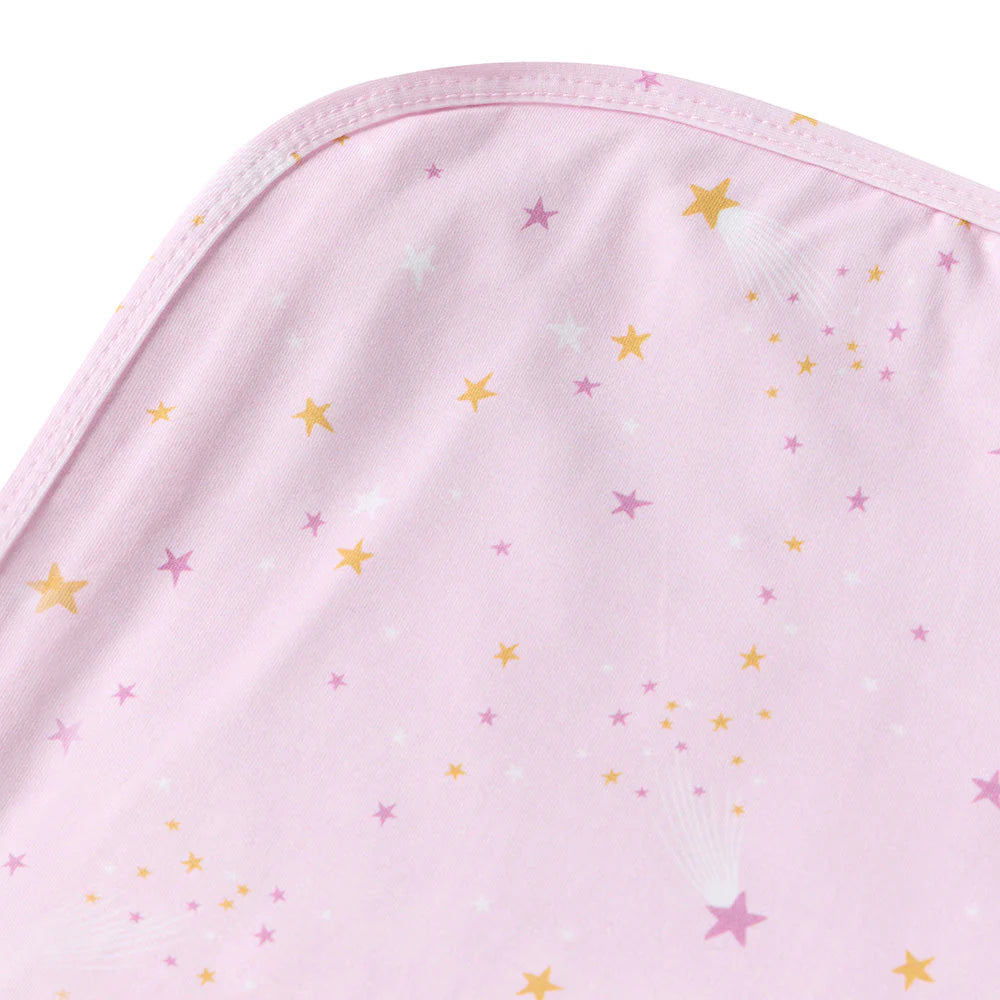 Our Snuggle Hunny organic cotton jersey wrap with matching topknot is soft, snuggly and stretches with baby. This wrap features our exclusive Snuggle Hunny Twinkle design and is made with GOTS Certified Organic Cotton CU 1182228.